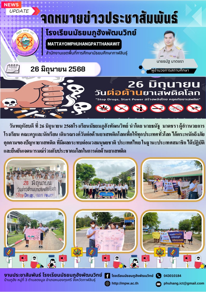 วันพฤหัสบดี ที่ 26 มิถุนายน 2568โรงเรียนมัธยมภูฮังพัฒนวิทย์ นําโดย นายธนัฐ มาตชรา ผู้อําานวยการโรงเรียน คณะครูและนักเรียน เดินรณรงค์วันต่อต้านยาเสพติดโลกเพื่อให้ทุกประเทศทั่วโลก ได้ตระหนักถึงภัยคุกคามของปัญหายาเสพติด ที่มีผลกระทบต่อมวลมนุษยชาติ ประเทศไทย ในฐานะประเทศสมาชิก ได้ปฏิบัติและยืนยันเจตนารมณ์ร่วมกับประชาคมโลกในการต่อต้านยาเสพติด |