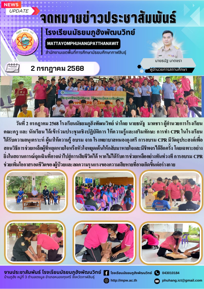 วันที่ 2 กรกฎาคม 2568 โรงเรียนมัธยมภูฮังพัฒนวิทย์ นำโดย นายธนัฐ มาตชรา ผู้อำนวยการโรงเรียน คณะครู และ นักเรียน ได้เข้าร่วมประชุมเชิงปฏิบัติการ ให้ความรู้และเสริมทักษะ การทำ CPR ในโรงเรียน ได้รับความอนุเคราะห์ ผู้มาให้ความรู้ อบรม จาก โรงพยาบาลหนองกุงศรี การอบรม CPR มีวัตถุประสงค์เพื่อสอนวิธีการช่วยเหลือผู้ที่หยุดหายใจหรือหัวใจหยุดเต้นให้กลับมาหายใจและมีชีพจรได้อีกครั้ง โดยเฉพาะอย่างยิ่งในสถานการณ์ฉุกเฉินที่อาจนำไปสู่การเสียชีวิตได้ หากไม่ได้รับการช่วยเหลืออย่างทันท่วงที การอบรม CPR ช่วยเพิ่มโอกาสรอดชีวิตของผู้ป่วยและลดความรุนแรงของความเสียหายที่อาจเกิดขึ้นต่อร่างกาย |