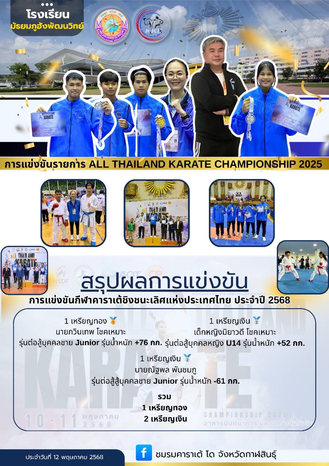 โรงเรียนมัธยมภูฮังพัฒนวิทย์ และชมรมคาราเต้ โด จังหวัดกาฬสินธุ์ ขอแสดงความยินดีกับนักกีฬาที่ได้รับรางวัล การแข่งขันรายการคาราเต้ชิงชนะเลิศแห่งประเทศไทย ประจำปี 2568 ( ALL THAILND KARATE CHAMPIONSHIP 2025